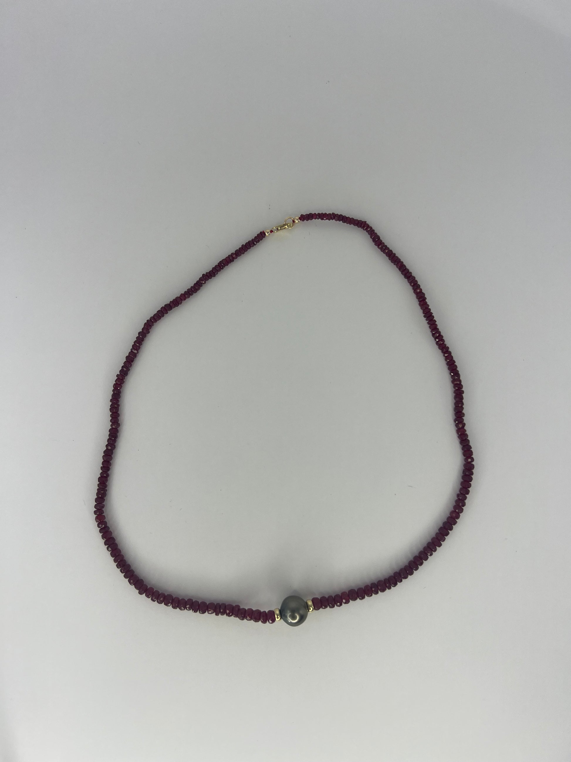 Collar de hilo de Rubis con Perla de Tahiti y argollas de oro amarillo 14k