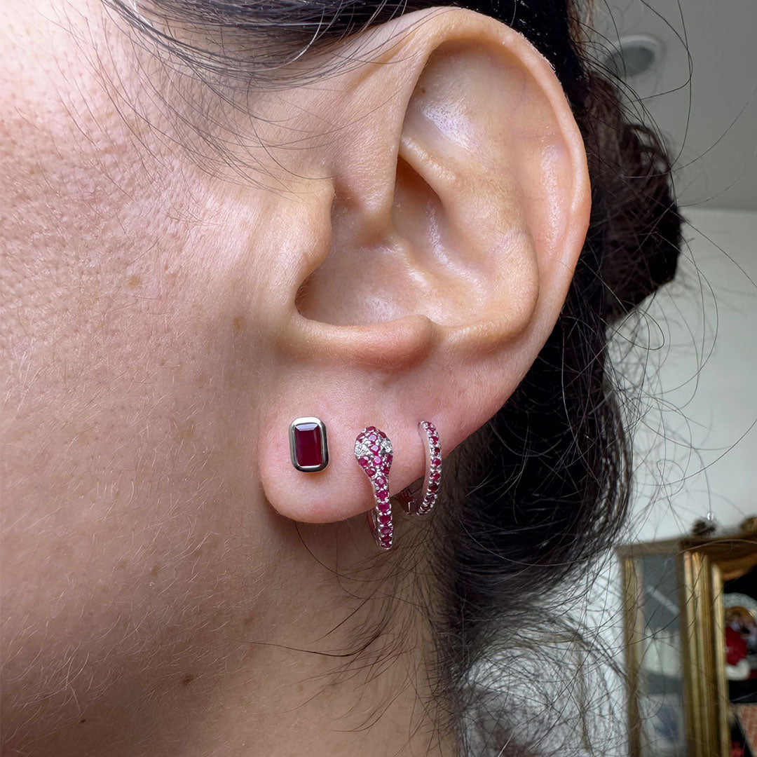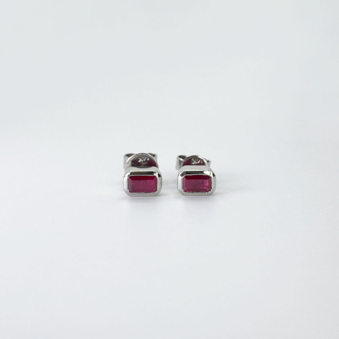 Aretes rubí con marco de oro blanco.