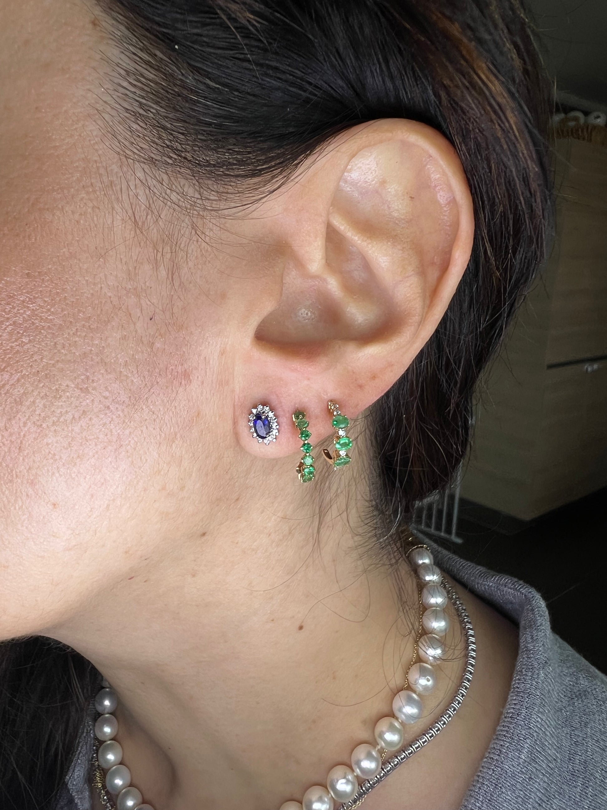 Broqueles de Zafiro en oro Blanco 14k, con Aro de Diamantes