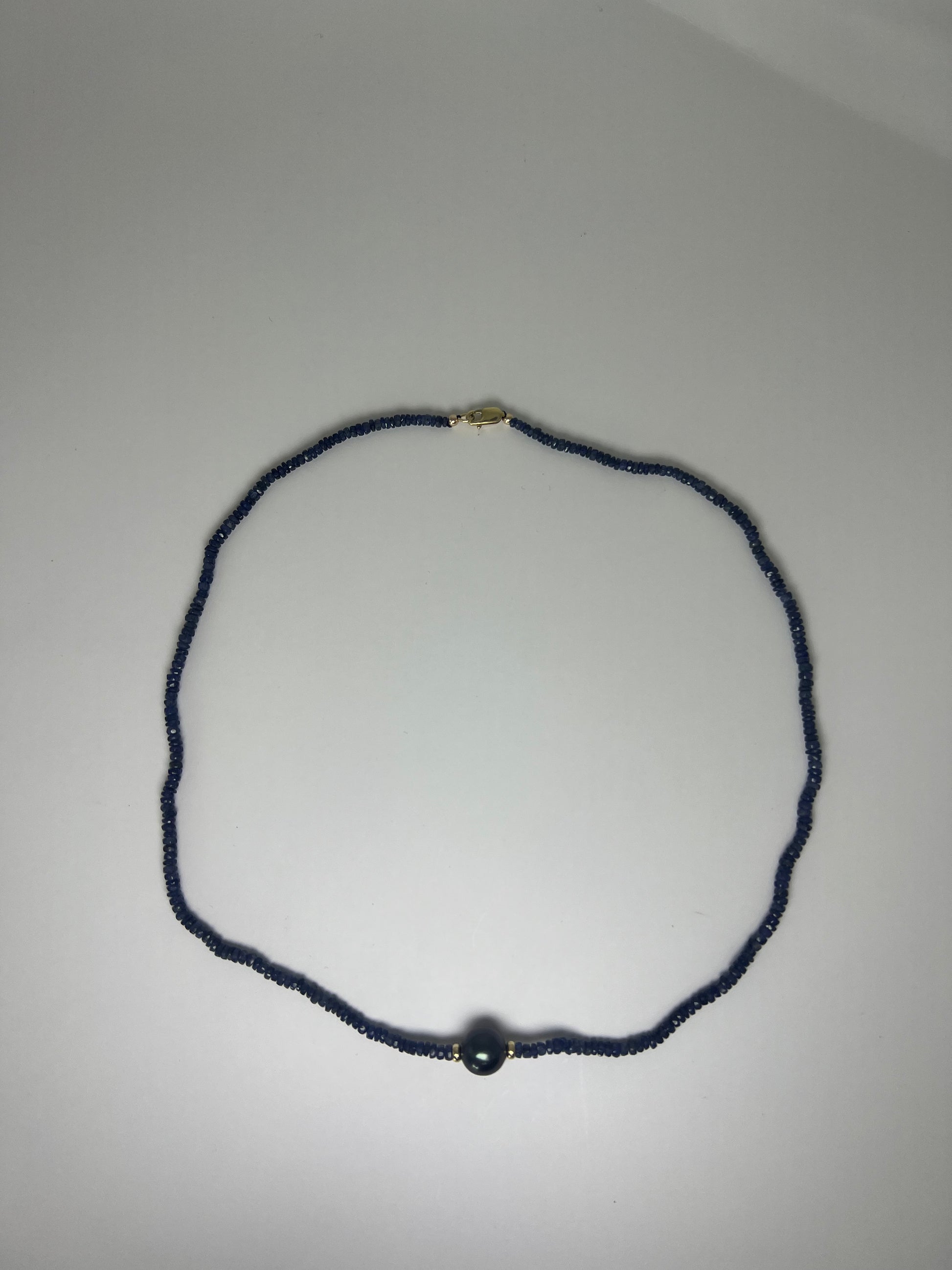 Collar de hilo de Zafiros con Perla de Tahiti y argollas de oro amarillo 14k