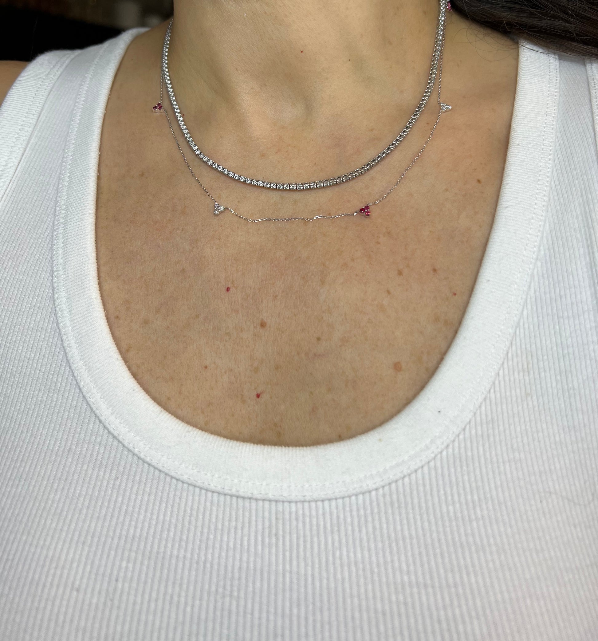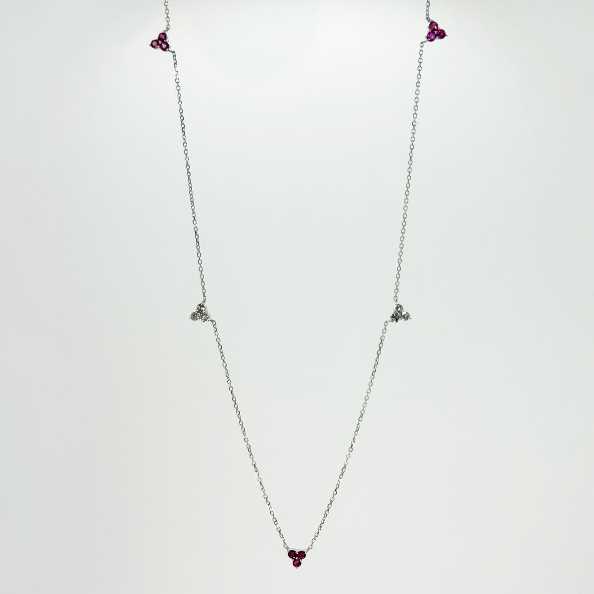 Tipo: Collar en oro blanco 14k, con diamantes naturales y rubíes
