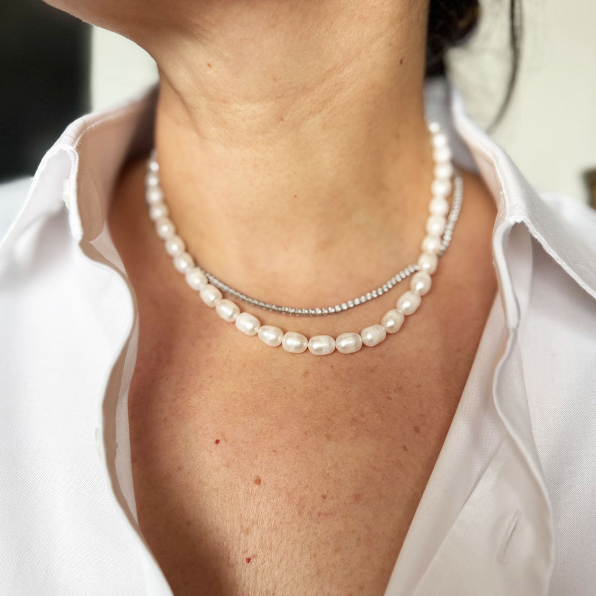 Tipo: Collar de perlas cultivadas, corto clásico, semi barrocas, con broche de plata