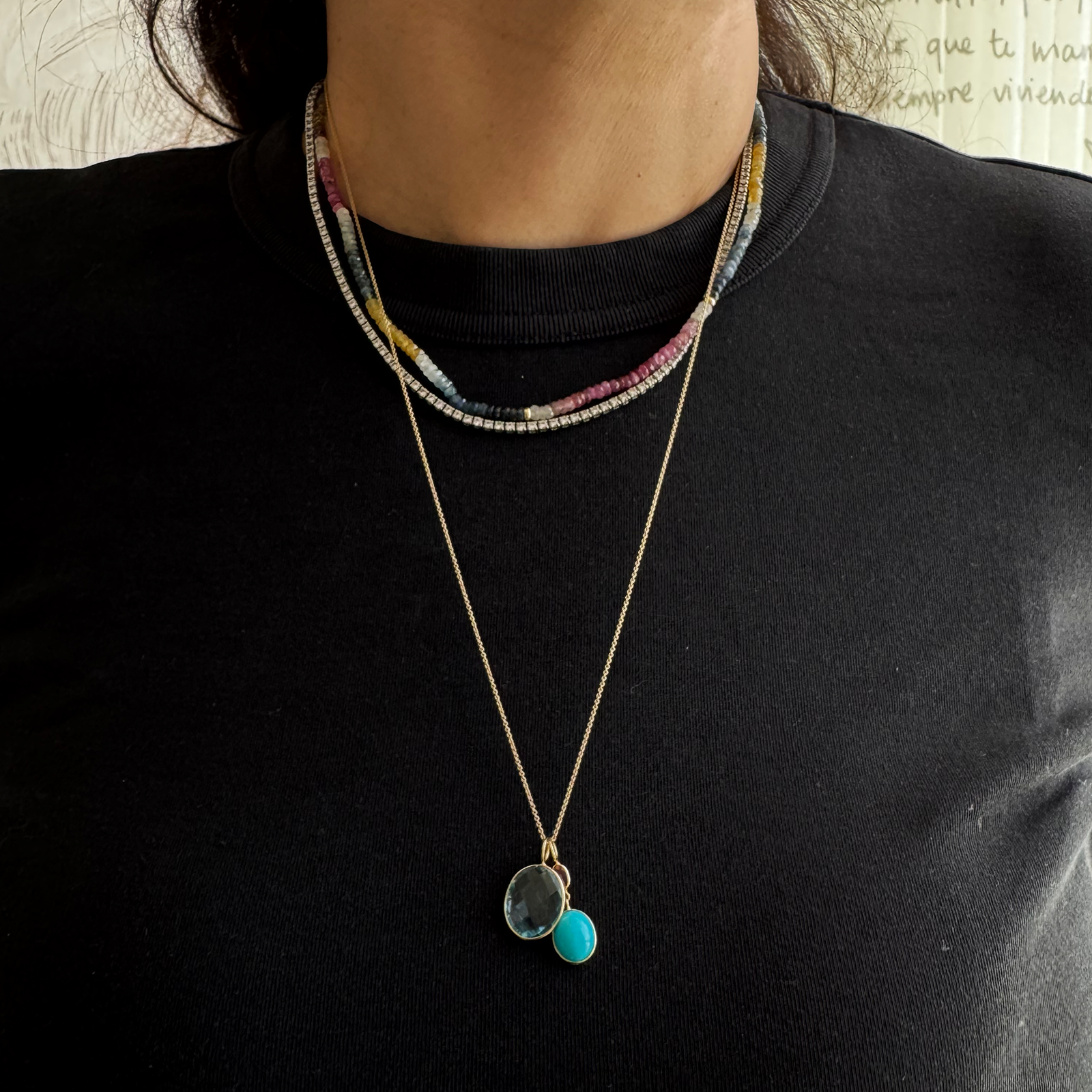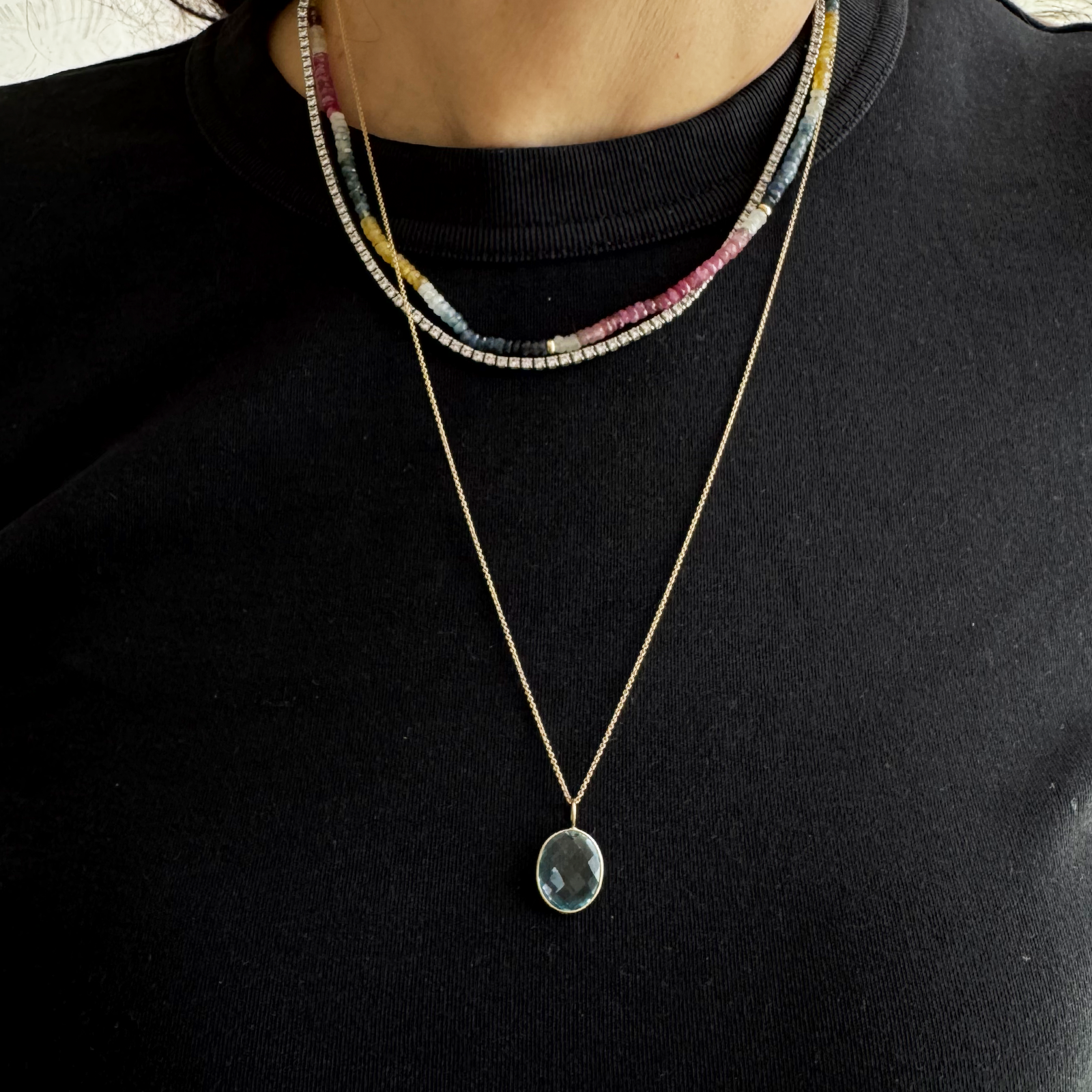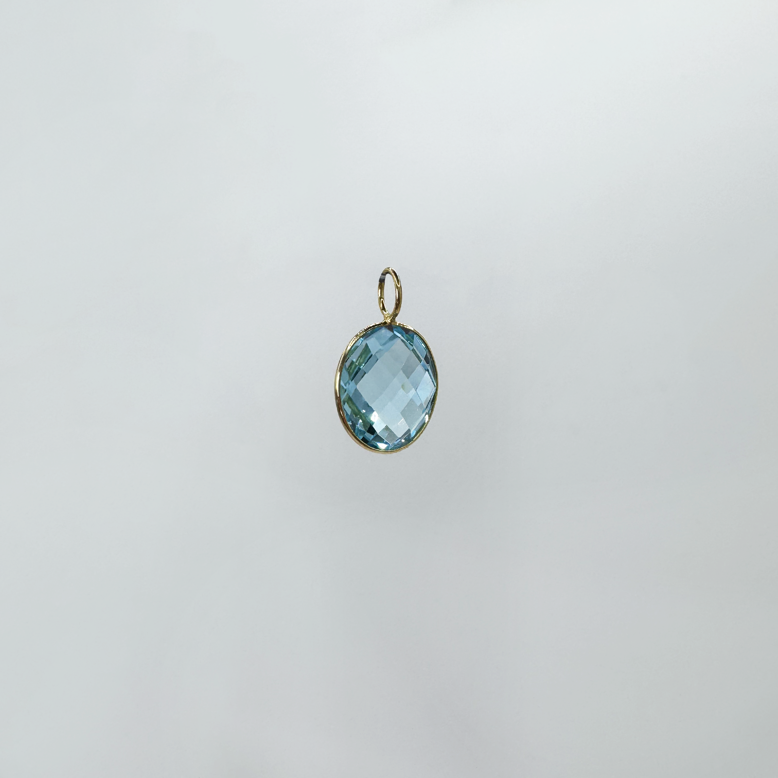Dije topacio azul traslúcido, oval y asa de oro 14k.