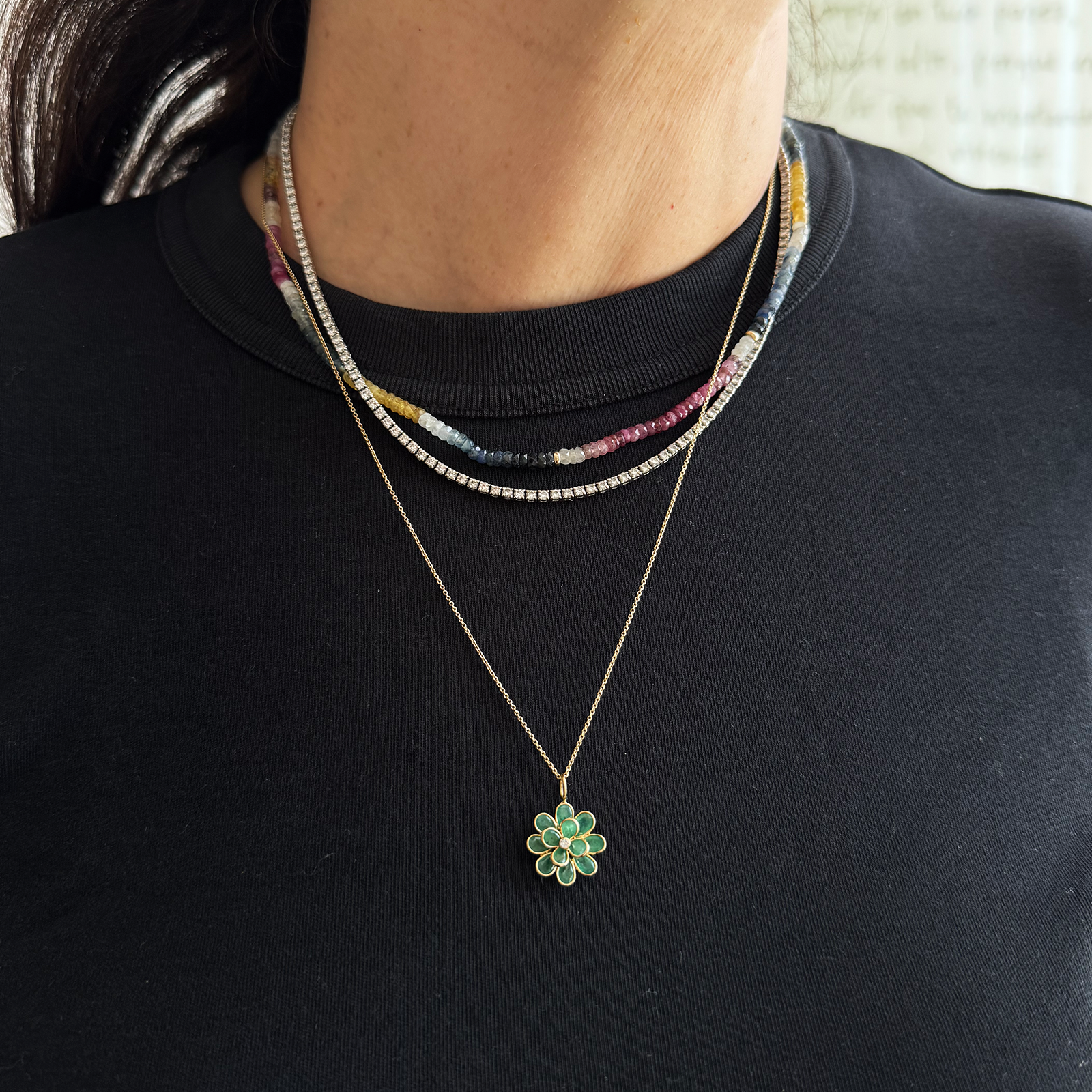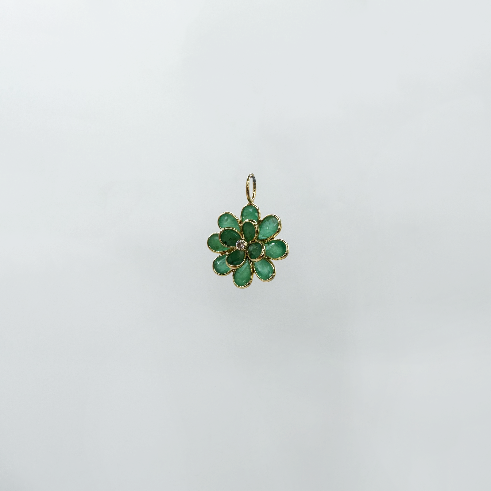 Dije de flor y esmeraldas, con un diamante en el centro, con asa de oro 14k.