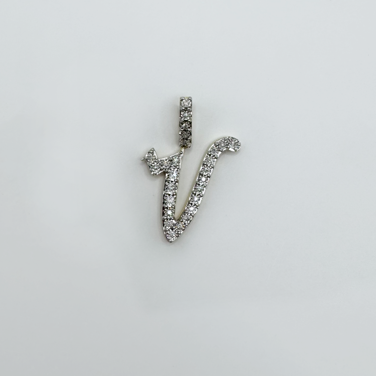 Dije letra "V" Cursiva en oro 10k y diamantes naturales.