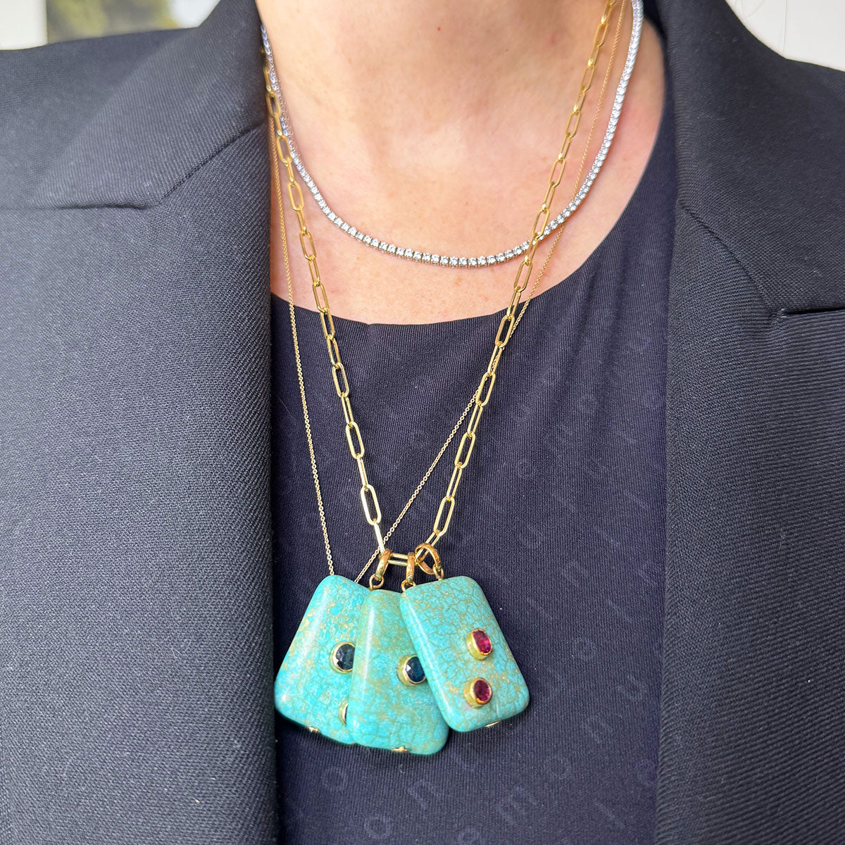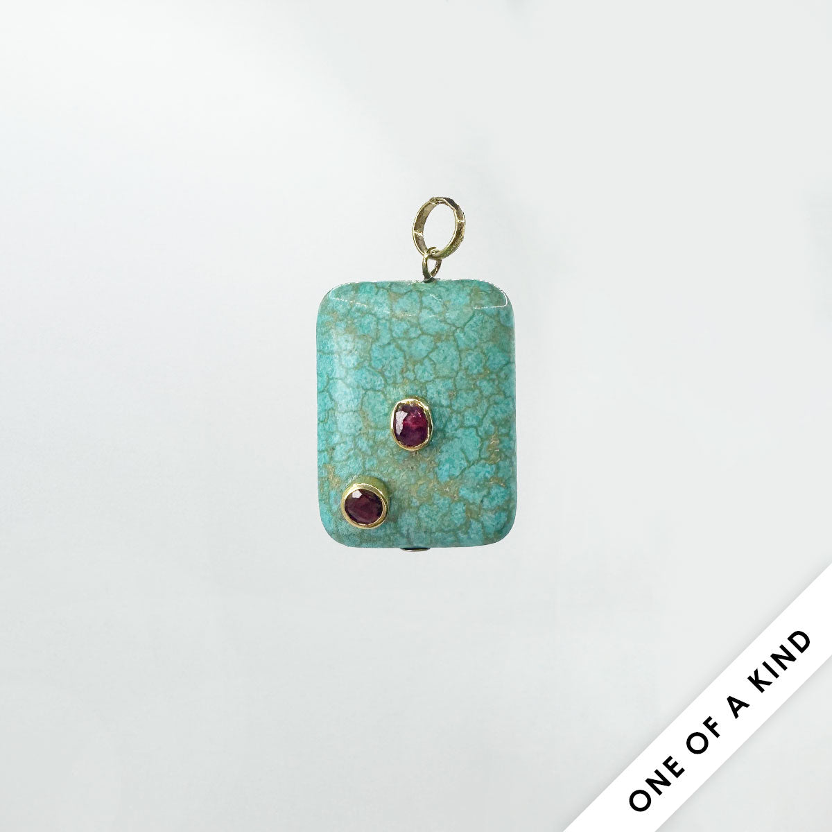 Tipo: Dije de turquesa natural con piedras preciosas (2 Rubies) y montadura en oro 14k